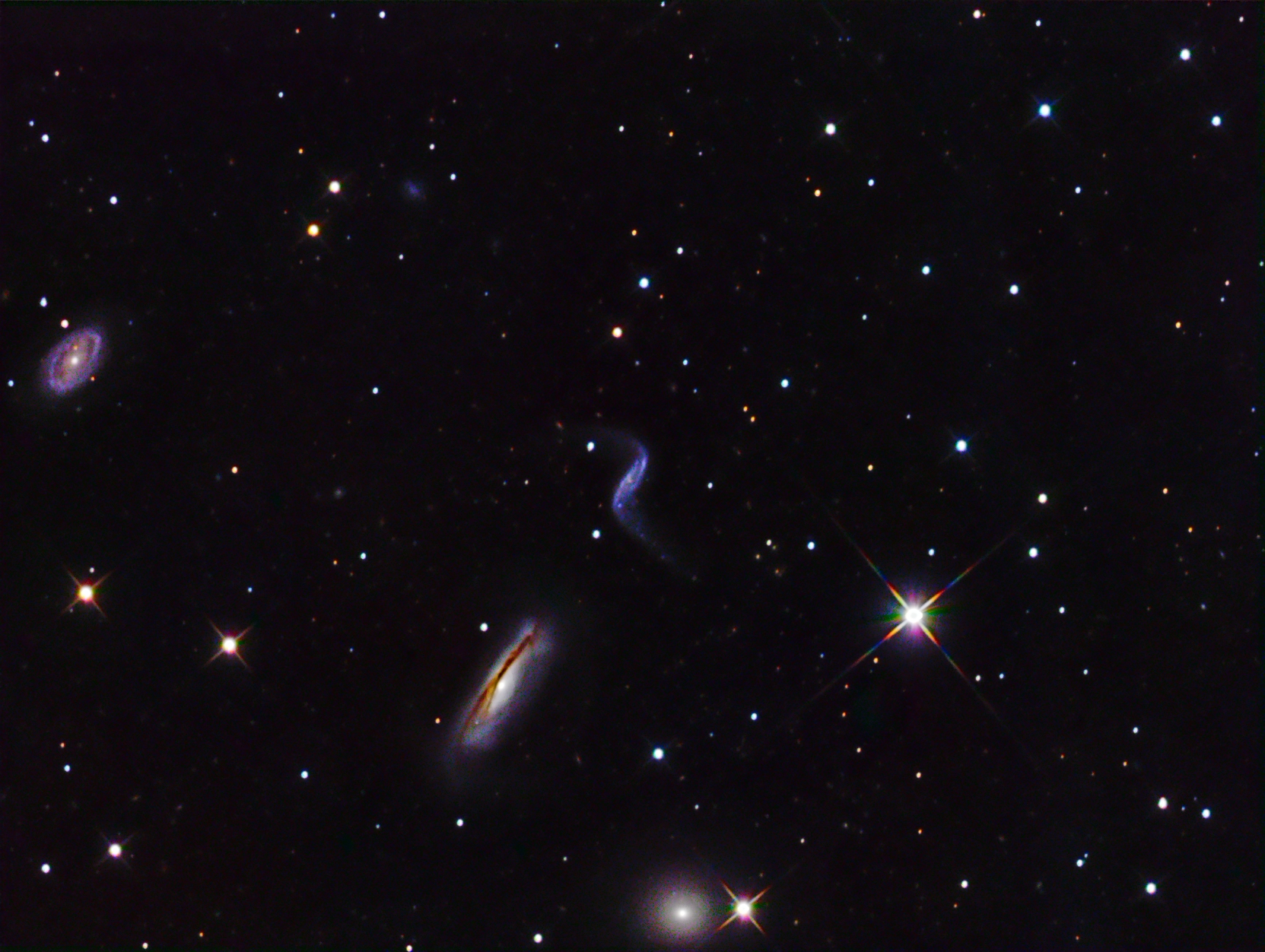 Description: NGC 3190 is member of Hickson 44 galaxy group, estimated at around 80 million light years away,[2] and consisting of four galaxies in a tight group - NGC 3193 is fairly featureless, NGC 3187 is a dim but striking spiral galaxy and NGC 3185 has a barred spiral structure with an outer ring.. [Ref: WikiPedia]